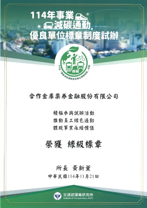 合庫票券積極參與減碳,提倡生活淨零轉型,114年11月21日榮獲交通部運輸研究所試辦「事業減碳通勤優良單位綠級標章」綠級標章肯定,由交通部運輸研究所黃新薰所長親自頒授,展現合庫票券在永續發展與員工綠色通勤推廣上之領先作為與表現。
